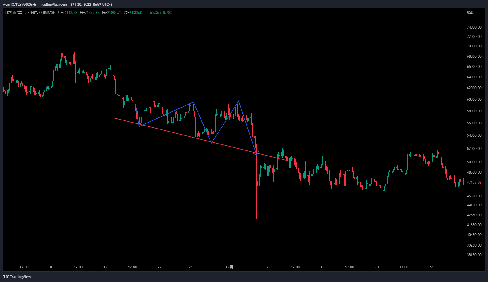 (2)每一次下降的低点基本处在一个水平线上,上涨的高点却逐渐降低。分别连接高点和高点、低点和低点,就形成上边线是水平的直角三角形。