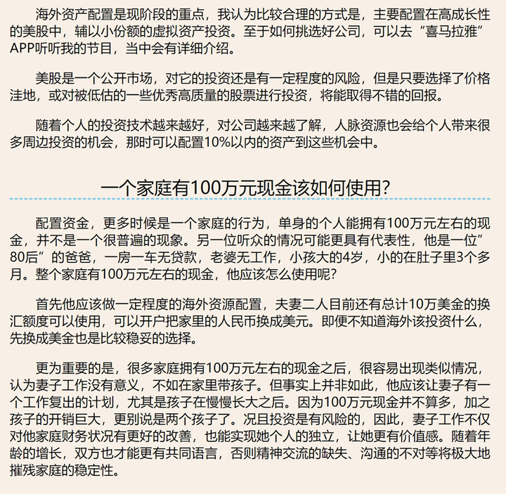 孙哥告诉你有100万以后该怎么做:海外资产配置(在涨价去库存和互联网行业火热的背景下,很多人上了中产作死三件套:贷款住千万的房子,太太全职,孩子上国际学校。而孙哥甚至建议,太太也要去工作,并给出了理由)