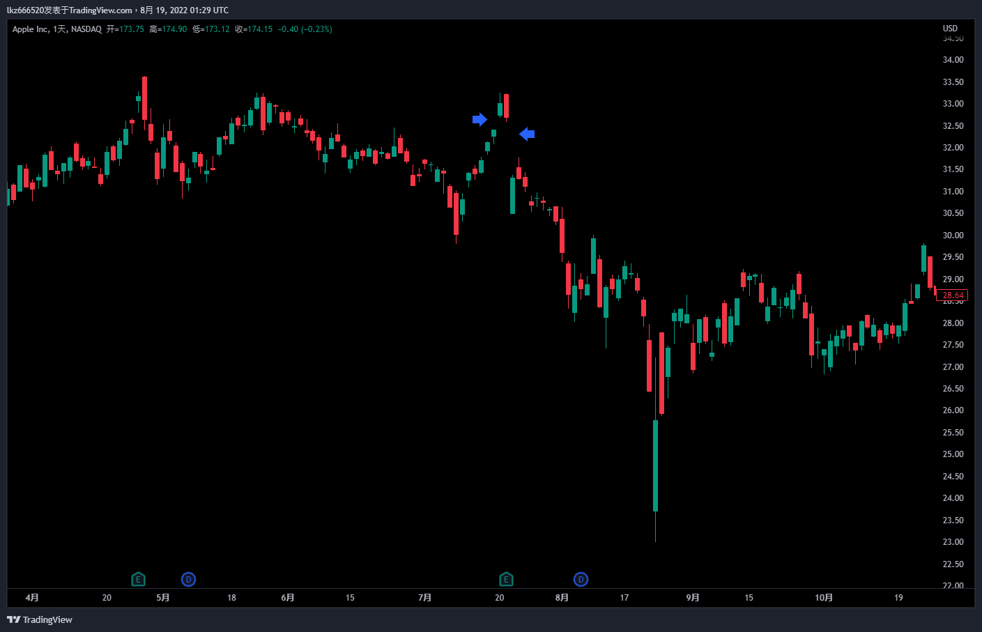 如图所示,第一个蓝色箭头所指为衰竭跳空,第二个蓝色箭头所指跳空完成岛型顶部形态。