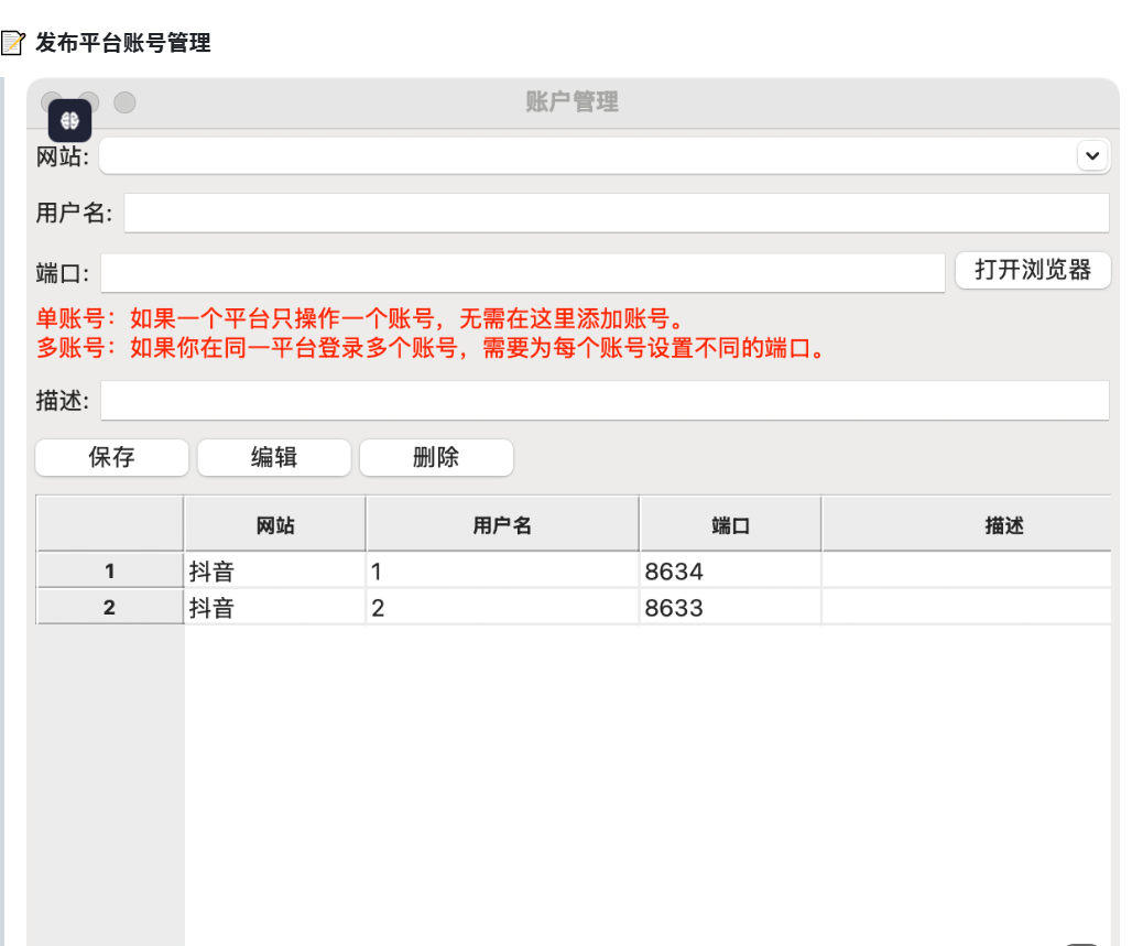 macOS 用户需通过终端执行命令移除应用的“隔离”标签后运行。首次使用时,点击“打开浏览器”按钮,在新打开的浏览器中登录目标平台账号。